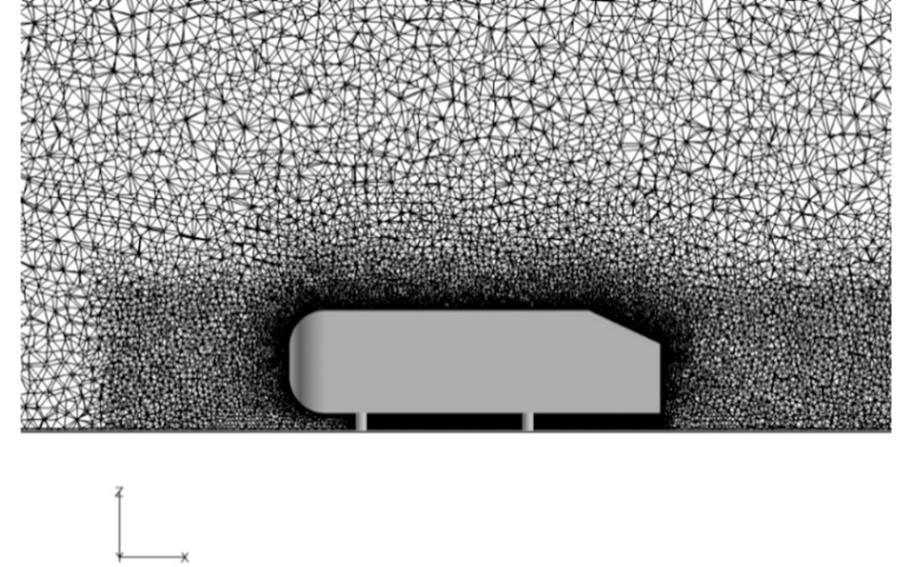 図3(a) に示す形状に対して左側から流速 40[m/s] の空気の流れが流入します。Ahmed body 形状は全長 1044[mm]、全幅 389[mm]、全高338[mm] となっており、レイノルズ数は ReL = 2.86×106 となっています。節点中心法により解析を行う場合、コントロールボリューム(CV)数は約 1,200 万要素となります。