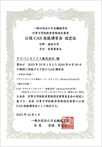 例年に引き続き、アドバンスソフトで実施している 技術者育成プログラム(社内研修)が、一般社団法人 日本機械学会 計算力学技術者試験認定事業委員会 の 公認 CAE 技能講習会(固体力学分野の有限要素法・熱流体力学分野)に認定されました。